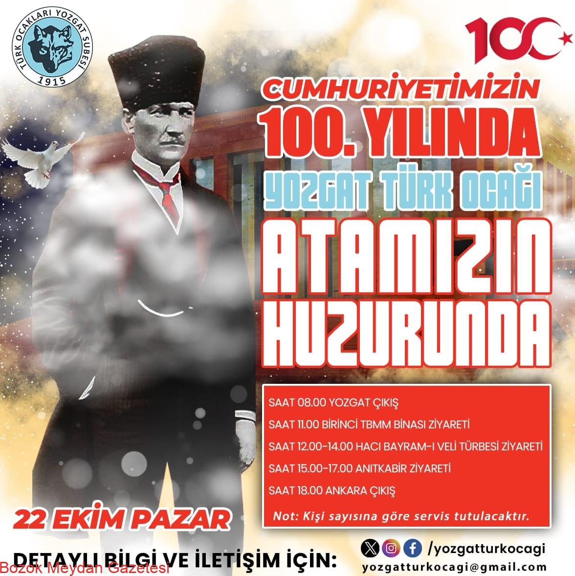 Türkiye Cumhuriyeti’nin 100. yıl dönümü coşkusunu paylaşmak amacıyla, Yozgat Türk Ocağı tarafından özel bir gezi programı düzenleniyor. Milli Mücadele ruhu ve Cumhuriyetimizin kuruluşunun yıldönümünü anmak için gerçekleştirilecek olan “Cumhuriyet’in 100. Yılında Yozgat Türk Ocağı Atamızın Huzurunda” etkinliği, 22 Ekim 2023 Pazar günü tüm katılımcılara kapılarını açacak.