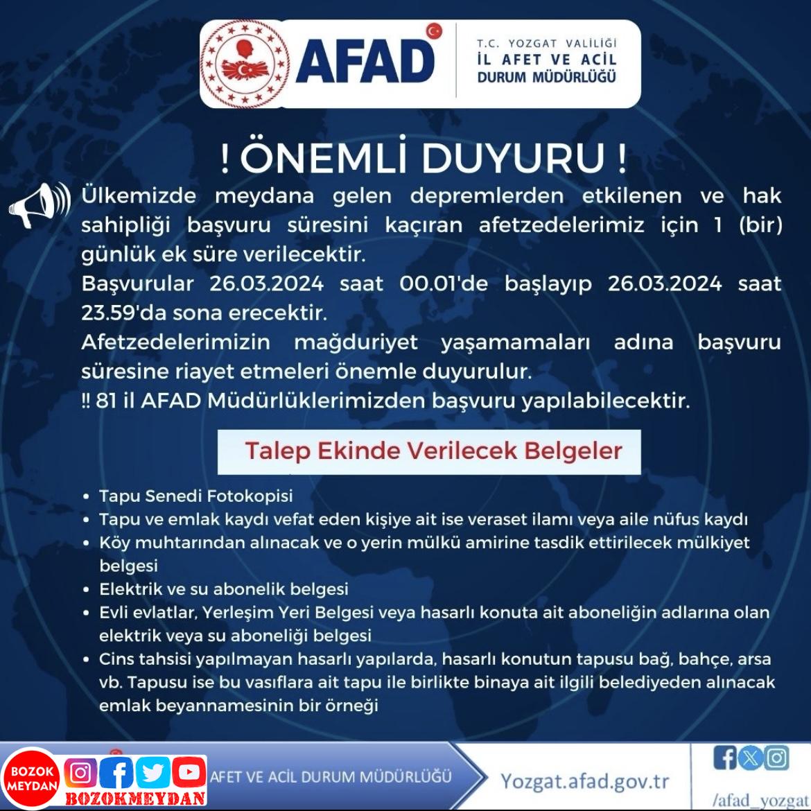 “06.02.2023 tarihli depremlerden etkilenen 11 ilimizde hak sahipliği başvuru süresini kaçıran afetzedelerimiz için bir günlük ek süre verme kararı aldık.”