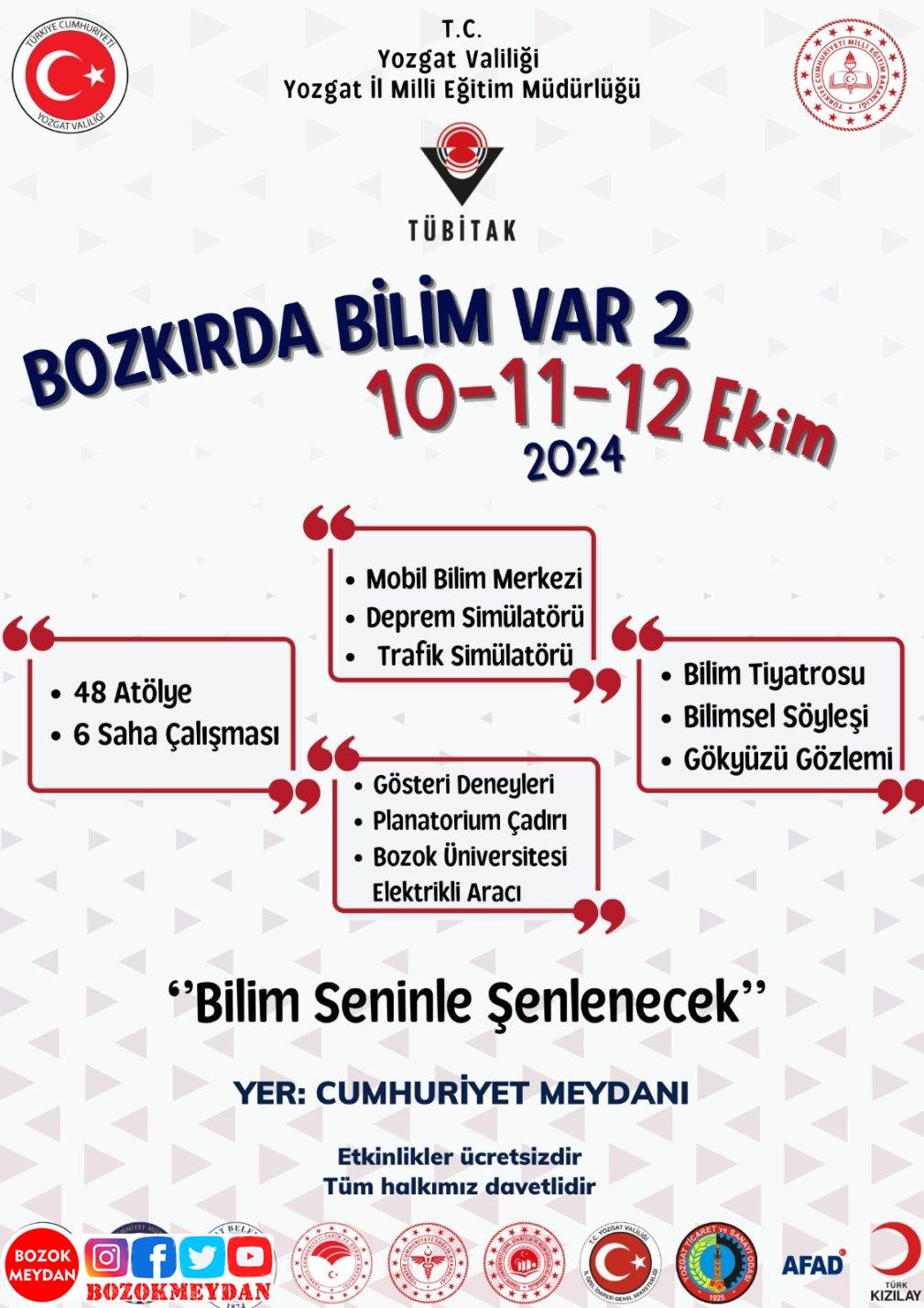 “Bozkır’da Bilim Var 2” projesi kapsamında düzenlenecek bilim şenliği, 10-11-12 Ekim 2024 tarihlerinde Yozgat Cumhuriyet Meydanında gerçekleştirilecek. İl Millî Eğitim Müdürlüğü, bu değerli projenin hazırlanmasında emeği geçen tüm meslektaşlarına teşekkür ederek, tüm halkı bilim fuarına davet etti.