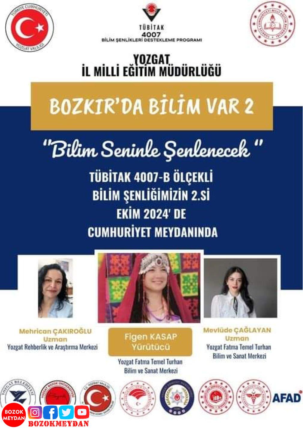 Yozgat İl Millî Eğitim Müdürlüğü tarafından hazırlanan ve Fatma Temel Turhan Bilim Sanat Merkezi öğretmeni Figen Kasap’ın yürütücülüğünü yaptığı “Bozkır’da Bilim Var 2” projesi, TÜBİTAK 4007 Bilim Şenliği Destekleme Programı B (Orta) Ölçekli Kategorisinde Türkiye genelinde yapılan 35 başvurudan destek almaya hak kazanan 9 proje arasında yer aldı.