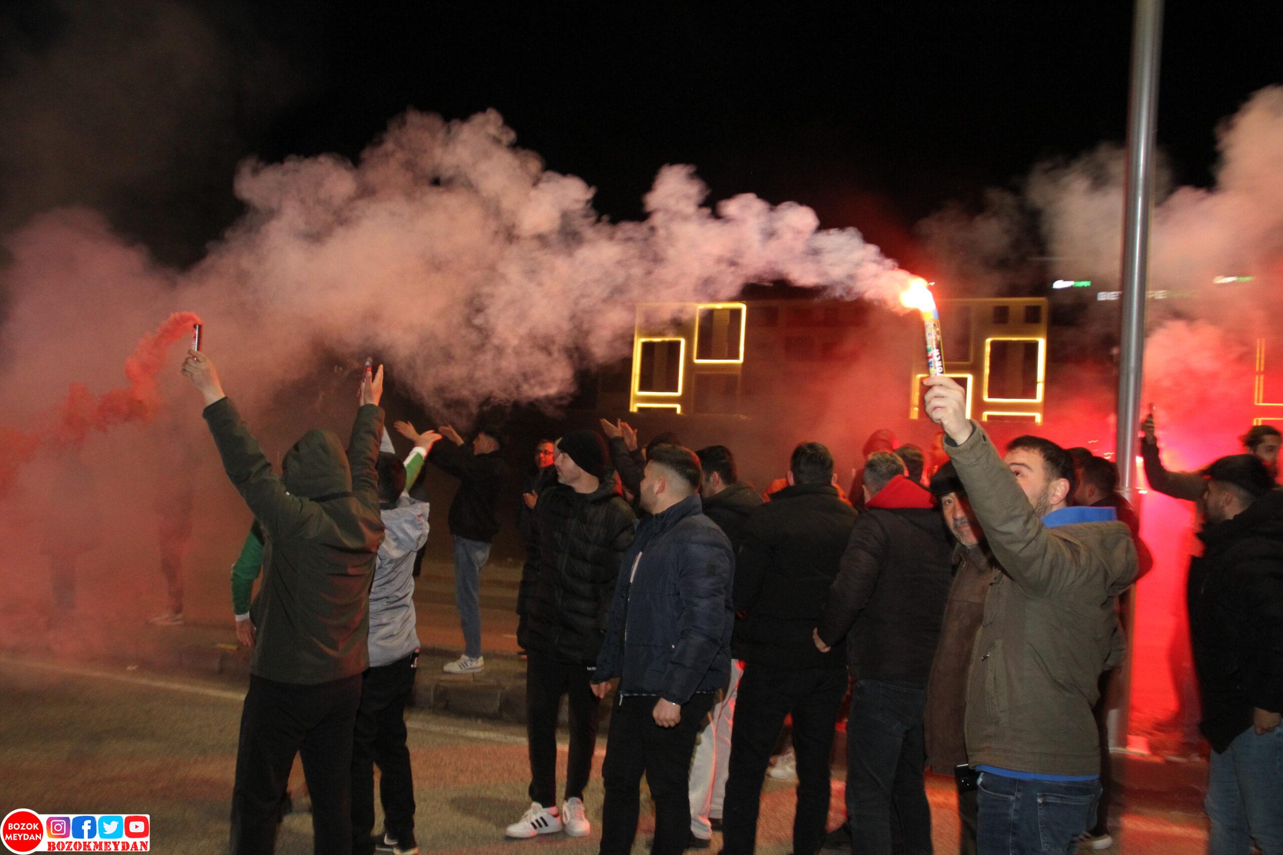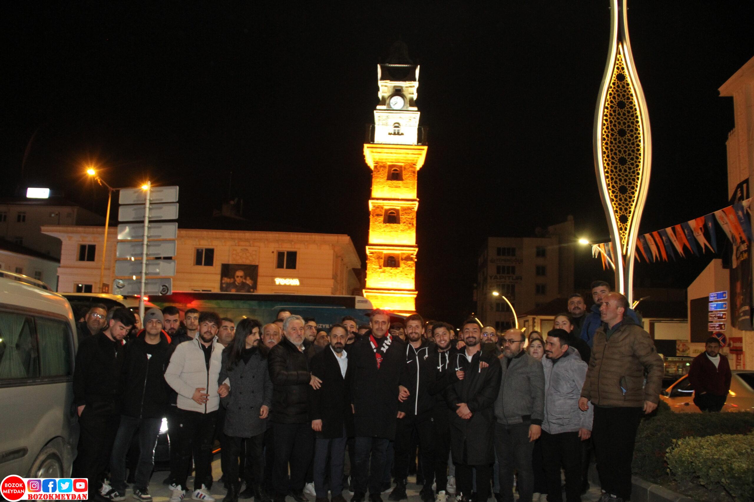 Lig mücadelesinin son haftalarına girerken kazanılan galibiyet sonrası kalabalık taraftar topluluğu tarafından şehir girişinde karşılanan Yozgat Belediyesi Bozok Spor kafilesi araç konvoyu ve meşaleler eşliğinde Cumhuriyet Meydanı’na gelerek taraftar ve şehir halkıyla galibiyeti kutladı.